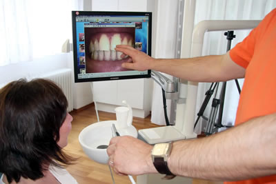 Neben dem Einsatz einer modernen "Intraoralen Kamera", bei der das Mundinnere am Monitor sichtbar wird, greifen wir auch auf klassische Schautafeln und Bilder zurück.